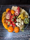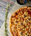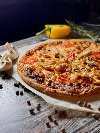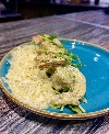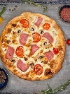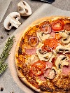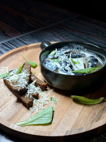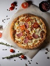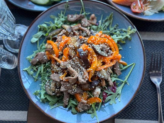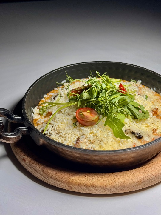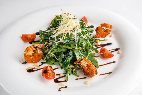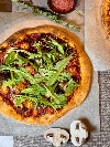 Говяжья вырезка, лук, шампиньоны, сливки, чеснок, моцарелла, помидор, руккола, белое вино, соус