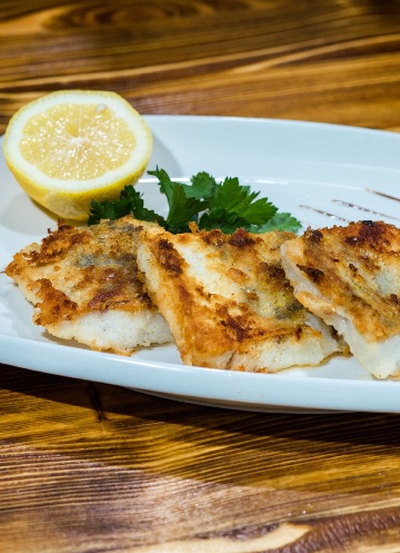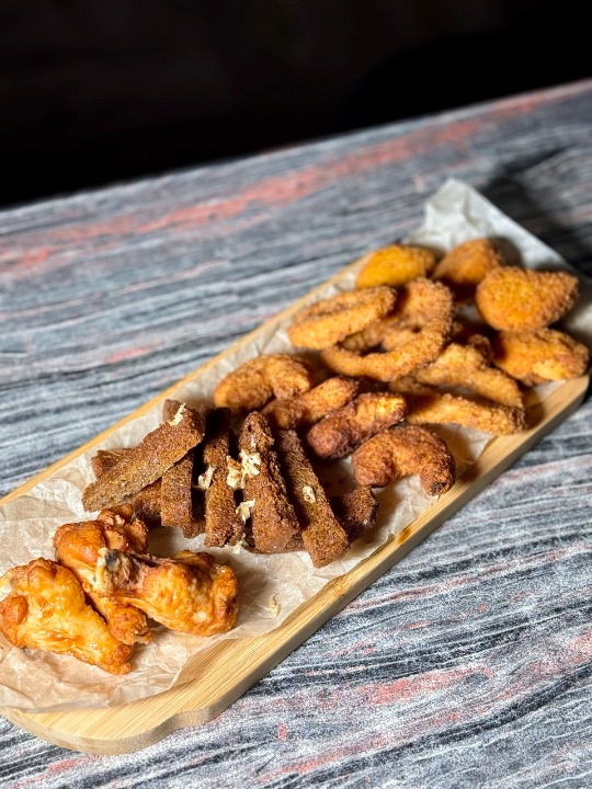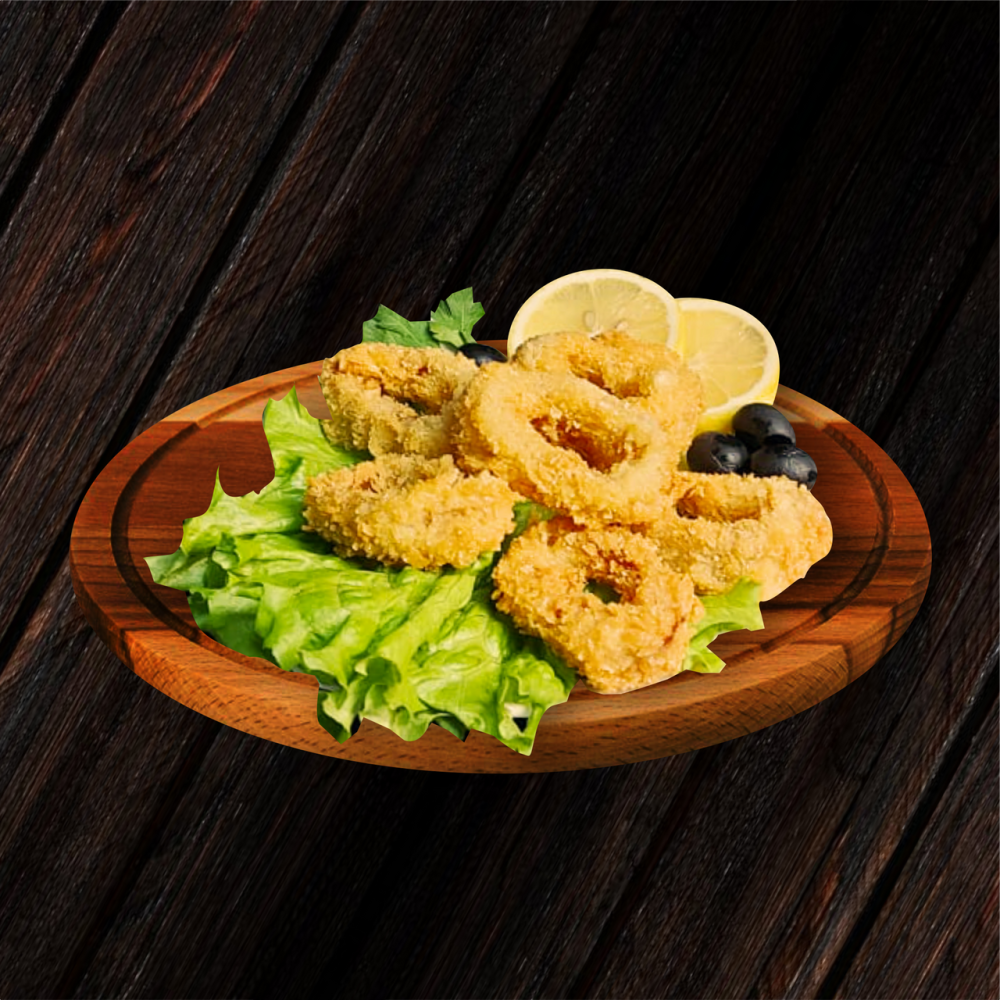 Стрипсы, кольца кальмара, гренки, креветки в кляре