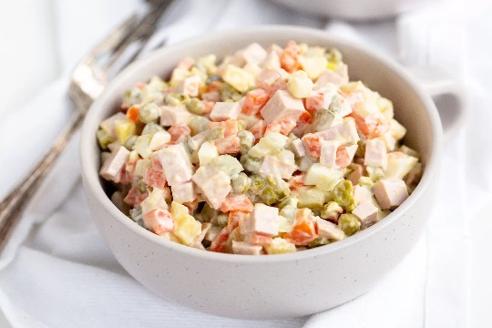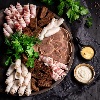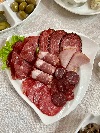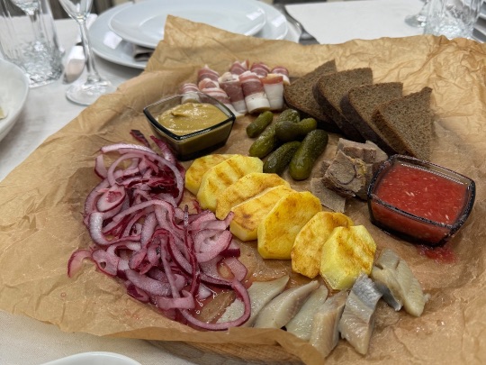Селедка (филе) картофель, сало, говяжий язык, куриный паштет, шпик, соленый огурец, лук, черный хлеб, хрен