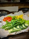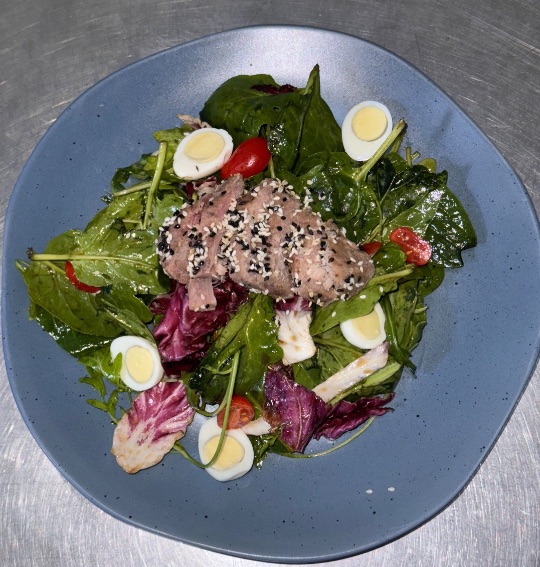 Курица/семга/креветки, черри, пармезан, перепелиные яйца, айсберг, сухарики