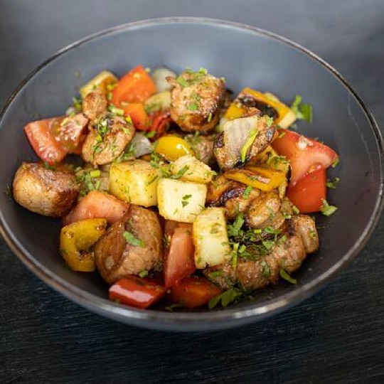 свинина/говядина/курица, картофель, болгарский перец, шампиньоны, морковь, лук, помидор, зелень, чеснок